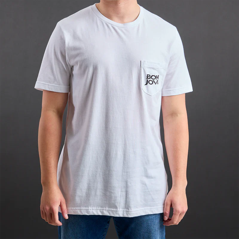 7800° Fahrenheit Staff T-Shirt features Bon Jovi logo on the front pocket with 7800° Fahrenheit Staff 1985 printed on the back.
