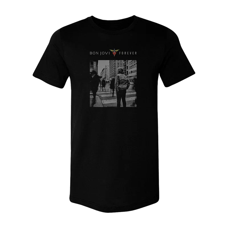 Black t-shirt features screen printed Bon Jovi Forever logo and cover art from the band’s latest album Forever.