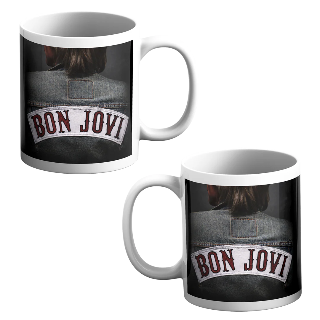 Bon Jovi Jacket Photo Mug features image of JBJ in iconic denim jacket printed on a white ceramic mug. 11 oz.